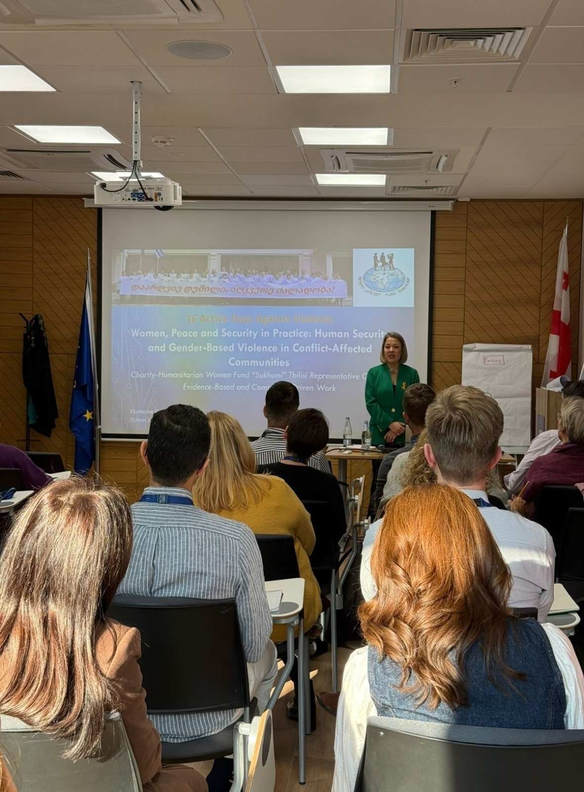 The meeting was held within the framework of the 16 Days of Activism Against Gender-Based Violence campaign. Ekaterine presented the key areas of the organization’s work, recent research findings, and the main security challenges faced by internally displaced and conflict-affected women — including rising social and economic risks, high prevalence of violence, and limited access to support services.